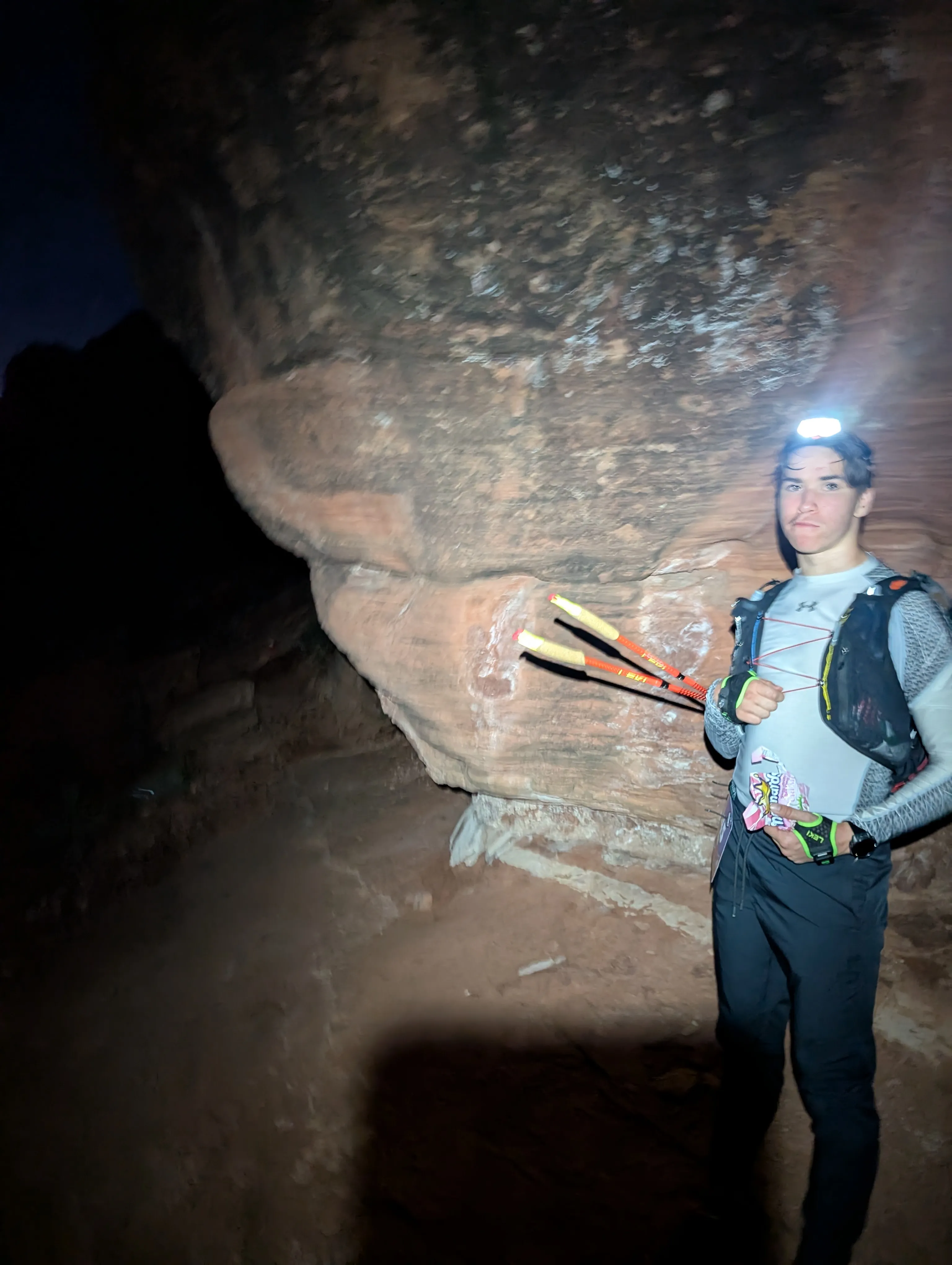 We rotated through mini-pushes, as an example: run 3km, walk 0.25km. At the Sedona aid station, we geared up for the cold night. It was too early to sleep.