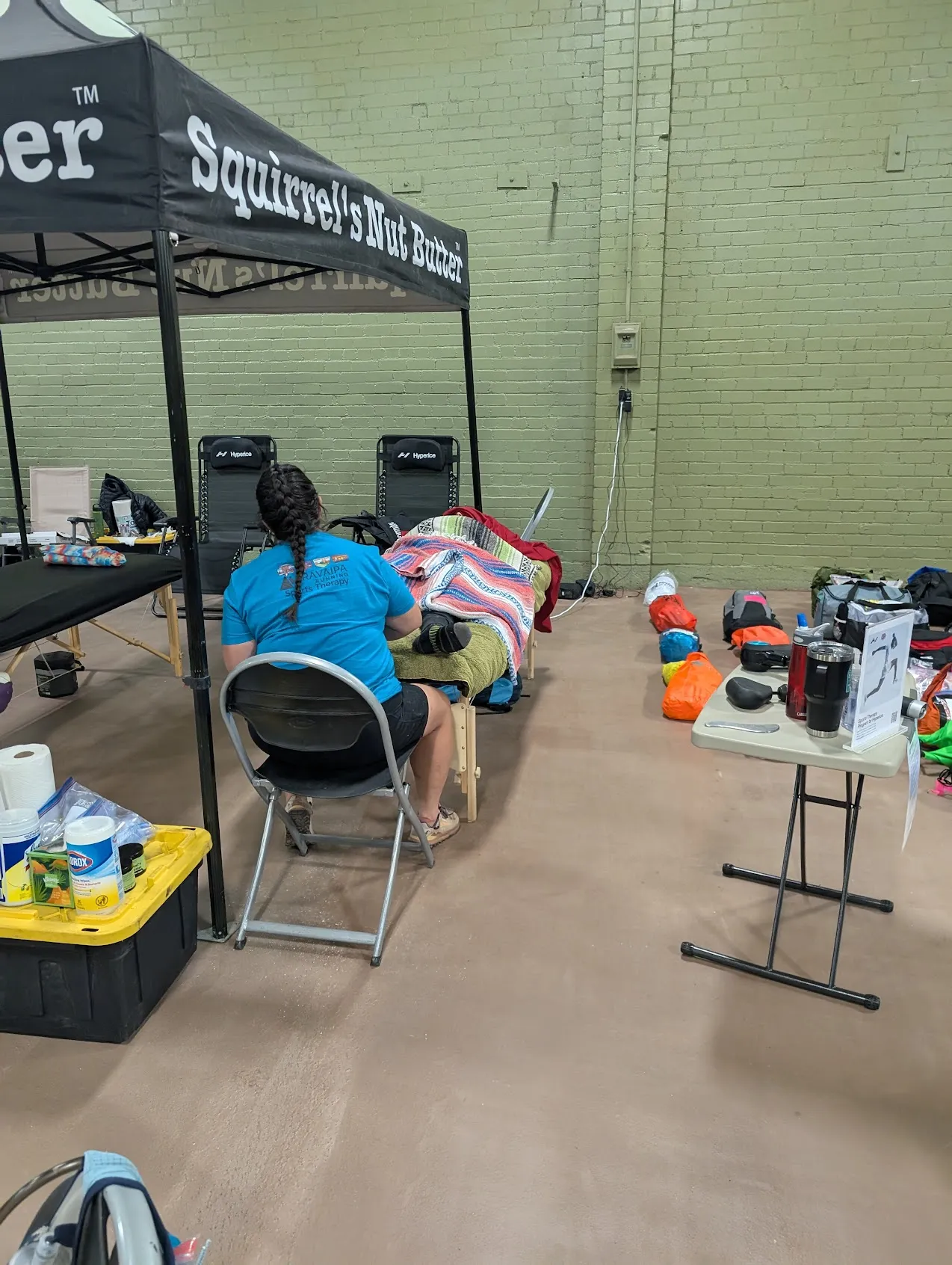 After running longer, we reached the second sleep station, Munds Park—our first real rest. Runners by the fire said all the tents were full. I didn’t want to rely on trail naps with Ronnie, it was cold. I headed for the medical tent. Both cots in the medical tent were taken, so I told Ronnie to try sleeping upright in a chair. Fifteen minutes later, a cot opened up and I had him grab it. He got 45 minutes of sleep. I nodded off for 15, hallucinating again. Then I prepped our gear for the next stretch.